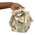 This piece, crafted from simple materials such as cloth, upcycled plastic and basic magnets, was turned into a delicate handheld bag.